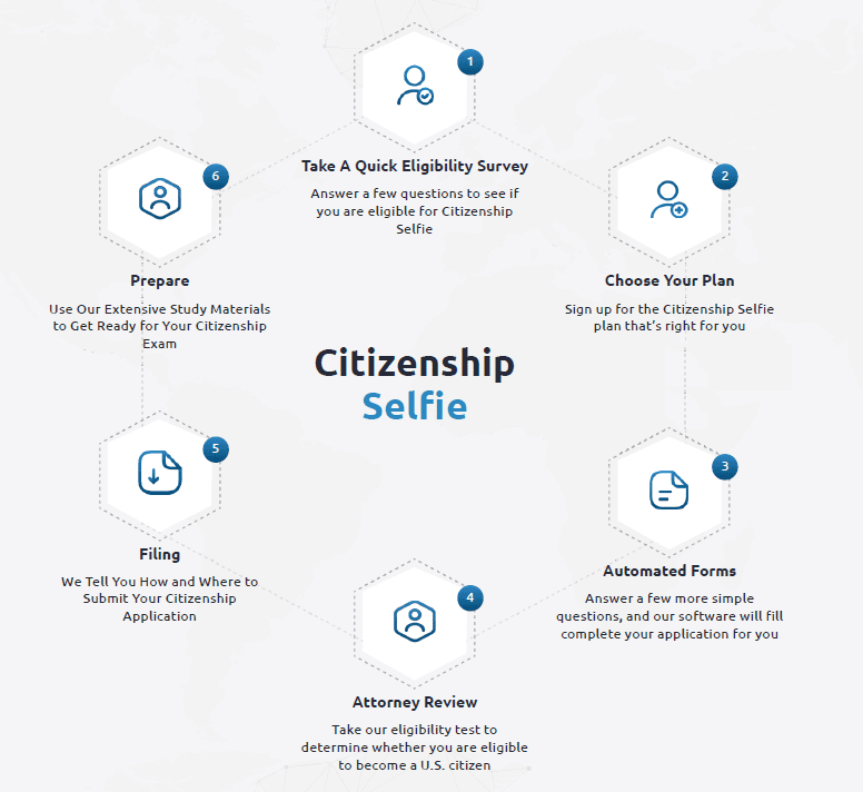 Becoming a U.S. citizen doesn’t have to be difficult. Citizenship Selfie helps make the application process simple with an all-in-one online platform that is affordable, easy to use, and designed to place citizenship within your reach. Citizenship Selfie was created by experienced immigration attorneys to offer an accessible solution to the problems they repeatedly watched applicants confront without lawyers–especially applicants who have trouble speaking English or passing the citizenship exam.